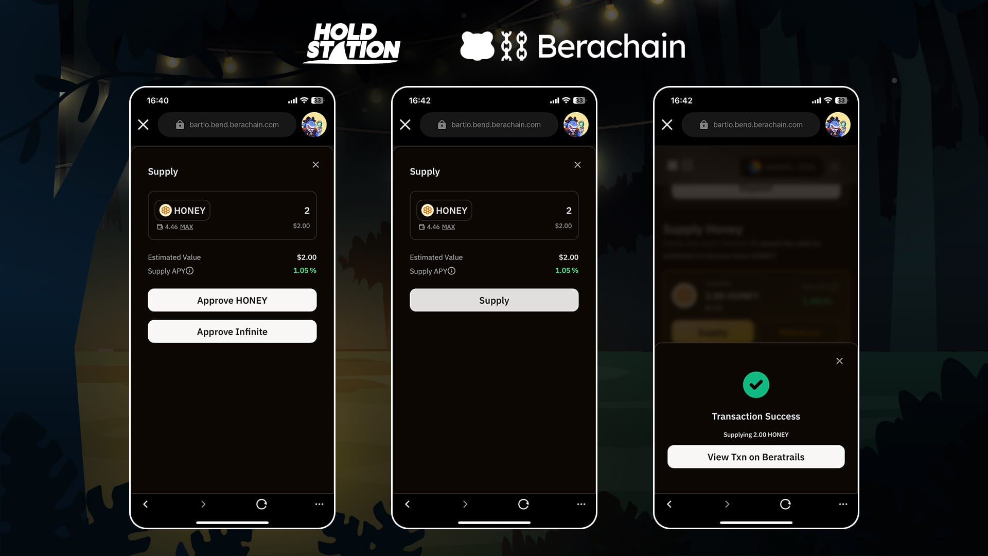 • Task: Supply HONEY tokens as liquidity on BEND, Berachain’s lending protocol.