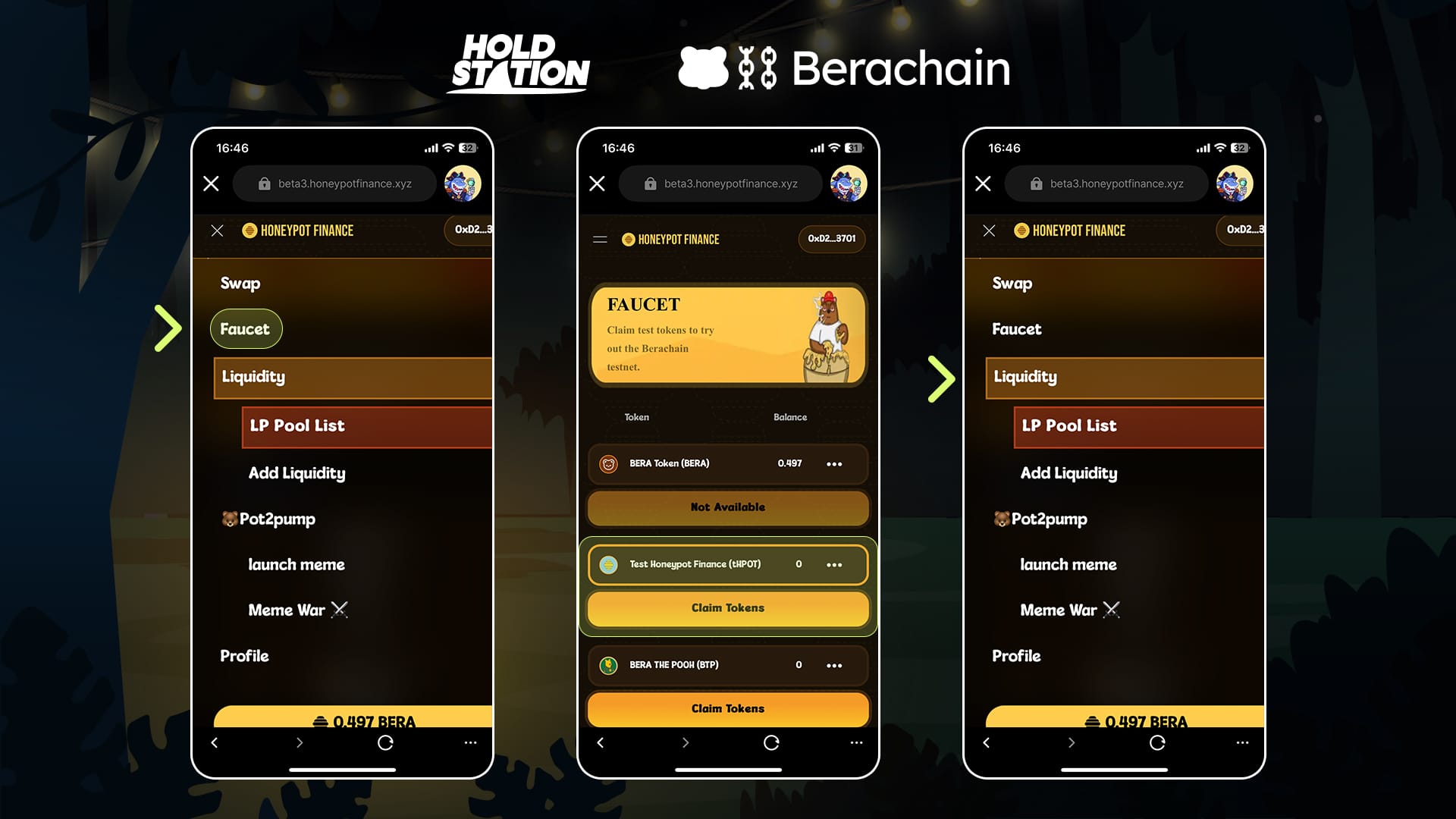 • Tap [Faucet], then on 'Test Honeypot Finance (tHPOT)' section, tap on [Claim Tokens]