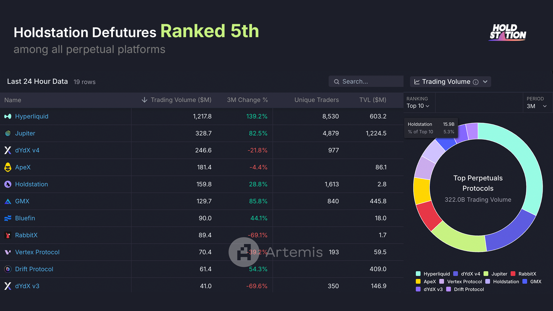 Holdstation's perpetual DEX, Holdstation Defutures, currently ranks 5th among all perpetual platforms, with a 24-hour trading volume of about $160M, according to Artemis Analytics.