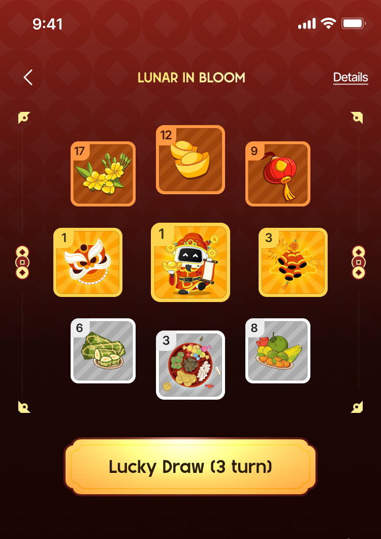 During the event, hunt for lucky money pieces (Gold, Silver, Bronze) by completing daily tasks. Each completed task brings a random lucky envelope containing pieces and USD1 rewards from $0.1 to $20. Collect a full set of 3 different pieces (e.g., plum blossom piece, lantern, and gold ingot count as 1 Bronze set) to qualify for big rewards from the shared prize pool.