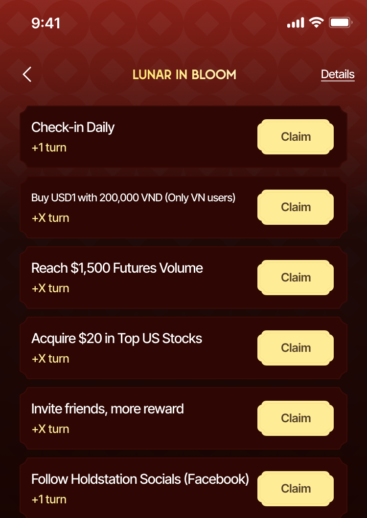 Welcome the new year with the Lunar in Bloom - Tet Holiday event from Holdstation! This special occasion lets you join fun activities, hunt for pieces, lucky envelopes, and win attractive prizes like USD1 and valuable e-vouchers. With a total prize pool of up to 5,000 USD for reward pieces, plus 500 USD1 daily for lucky users and hundreds of vouchers, the event promises a festive Tet atmosphere and "eternal prosperity" opportunities for all users.