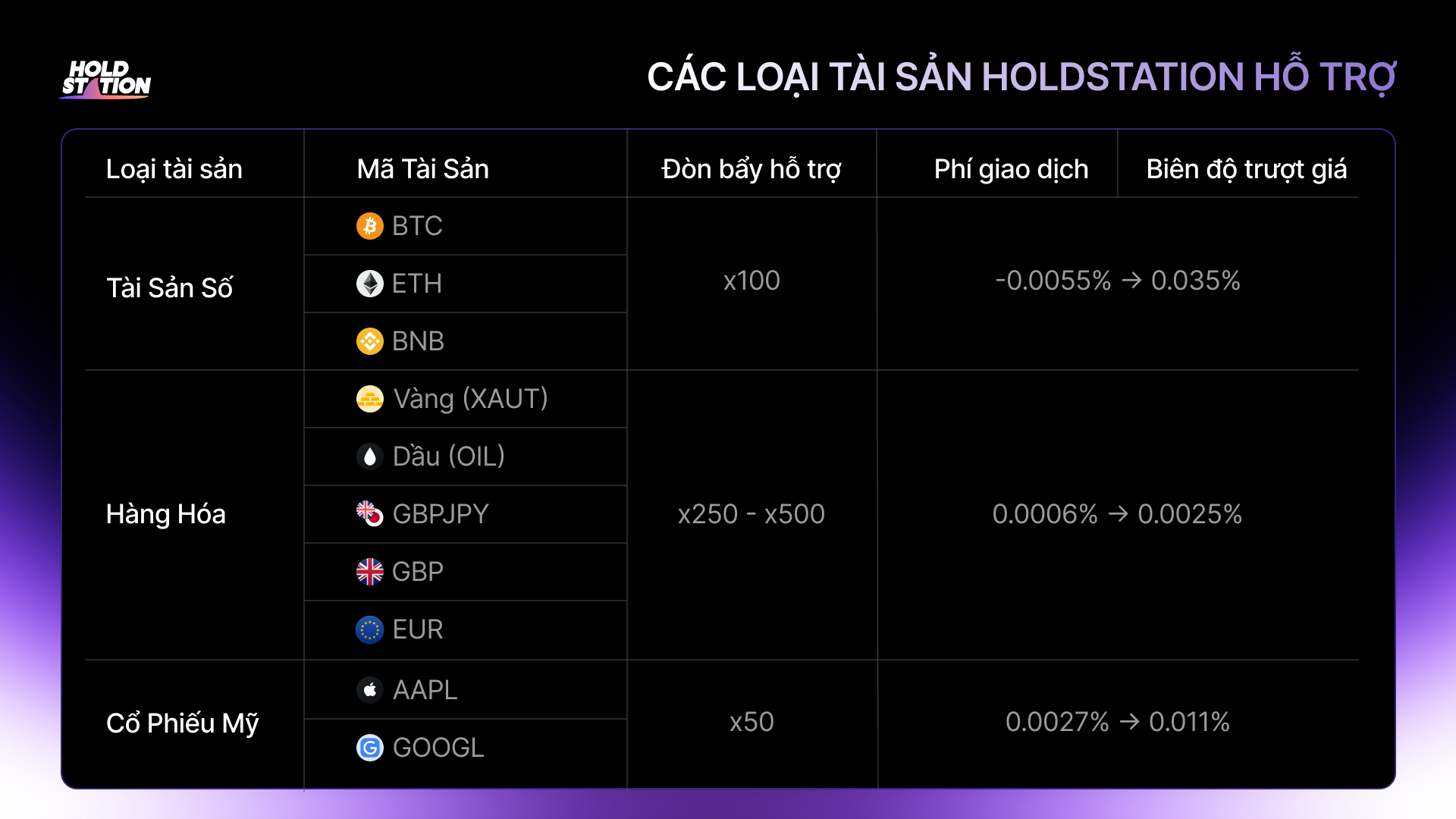 Holdstation DeFutures hỗ trợ giao dịch đòn bẩy đa dạng tài sản tài chính toàn cầu, từ Vàng, hàng hóa, đến cổ Phiếu Mỹ và Tài Sản Số