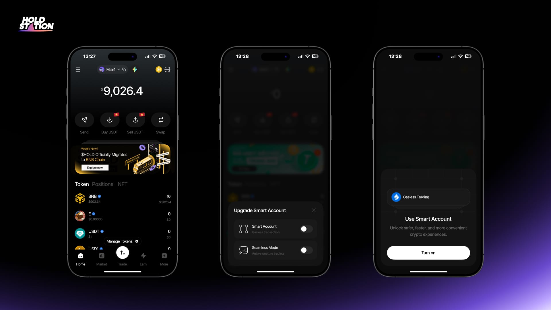 - Cách Kích Hoạt: Trong app Holdstation (iOS/Android/Web), chọn biểu tượng tia sét → Upgrade to Smart Account (miễn phí)