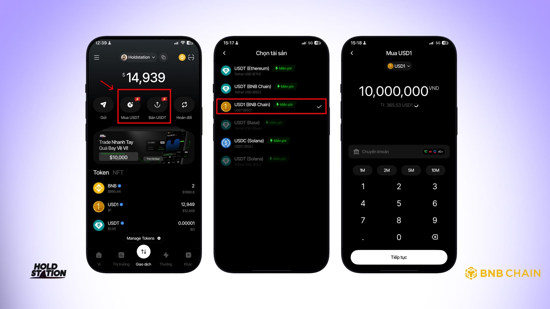Làm sao nạp USD1 trên BNB Chain? Nạp gas-free qua BNB Chain hoặc mua trực tiếp bằng VND trong ví Holdstation.